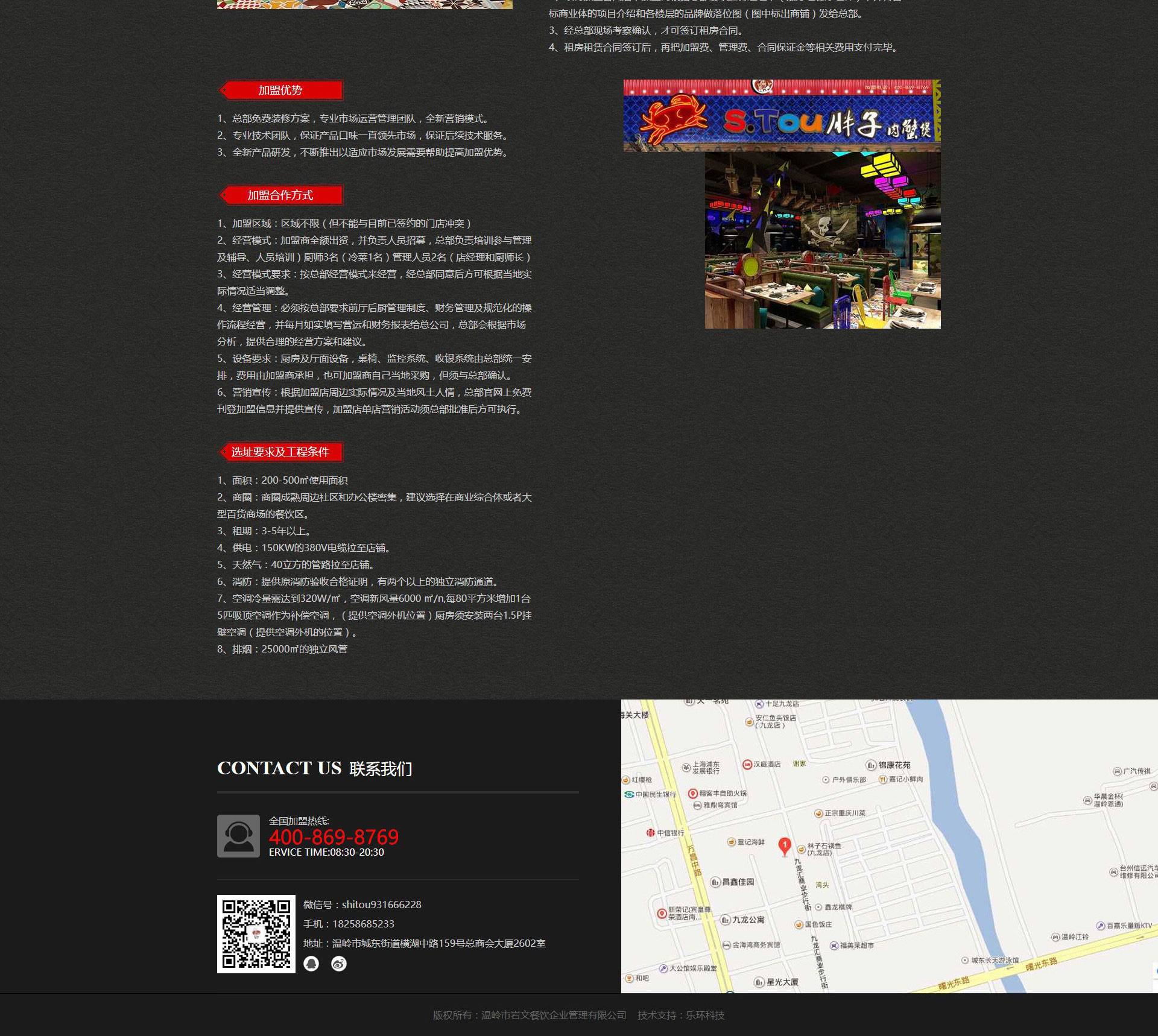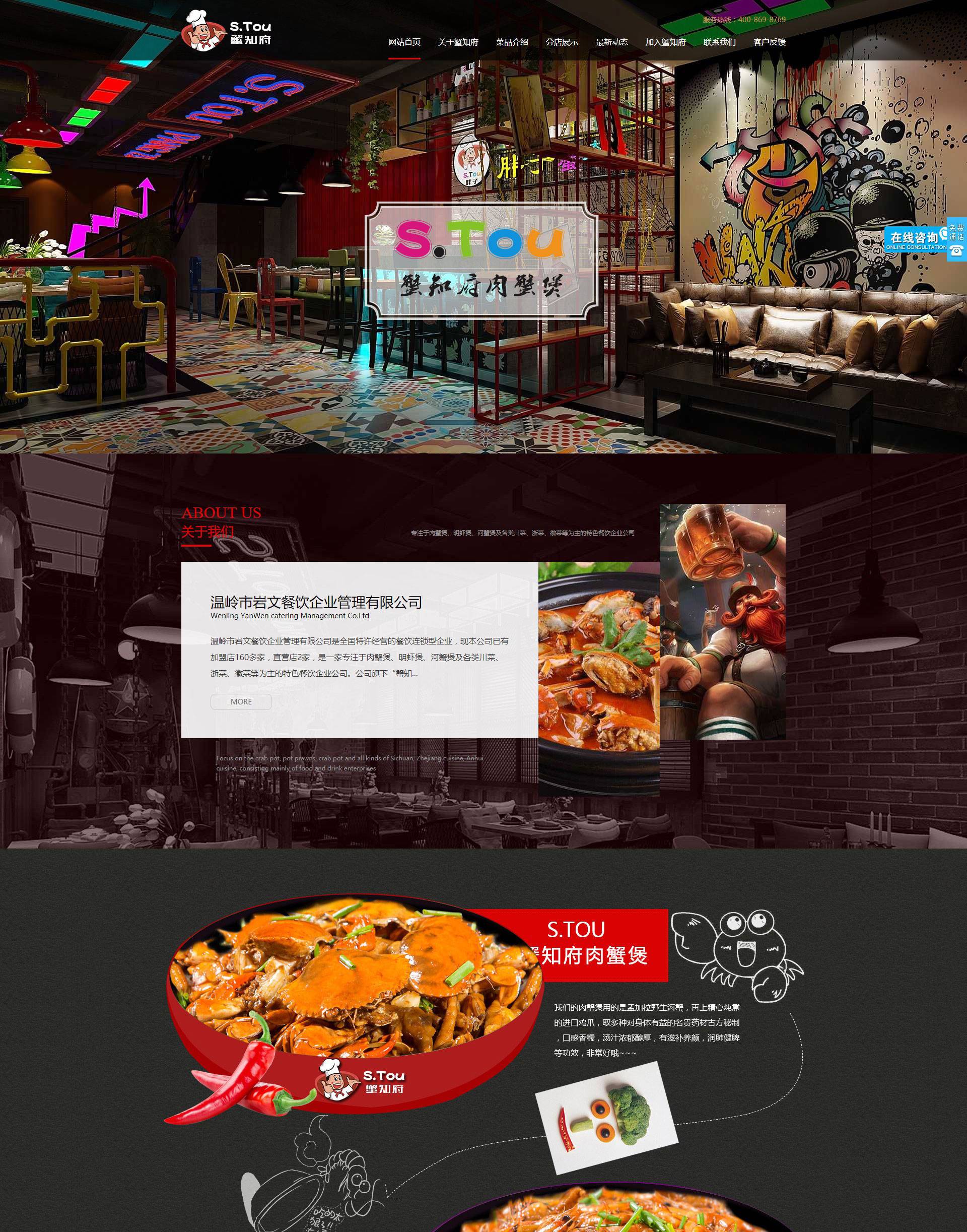 溫嶺市巖文餐飲企業(yè)管理有限公司是全國特許經(jīng)營的餐飲連鎖型企業(yè),現(xiàn)本公司已有加盟店160多家,直營店2家,是一家專注于肉蟹煲、明蝦煲、河蟹煲及各類川菜、浙菜、徽菜等為主的特色餐飲企業(yè)公司。公司旗下“蟹知府肉蟹煲“.“S.TOU胖子肉蟹煲”在國內(nèi)是較知名的餐飲品牌。2008年5月,浙江海鹽一位廚師與螃蟹有了第一次的親密接觸,從此便不可收拾的愛上了肉蟹煲。