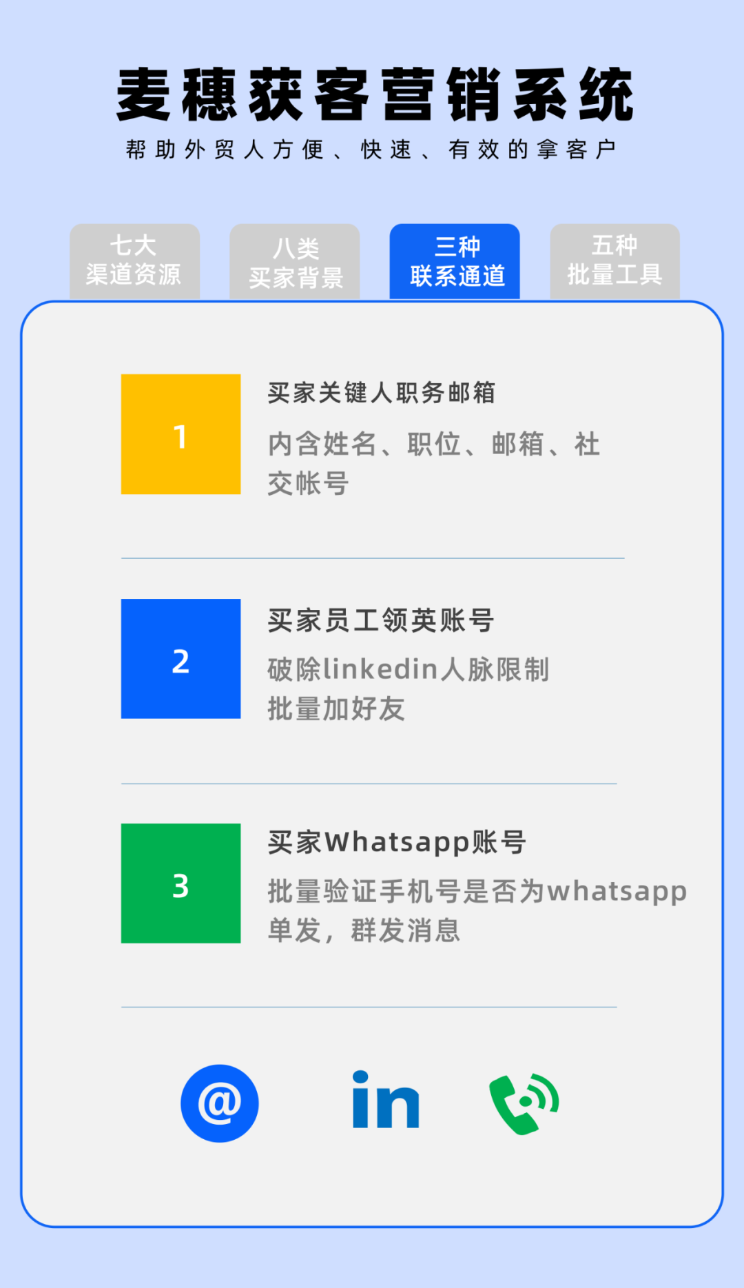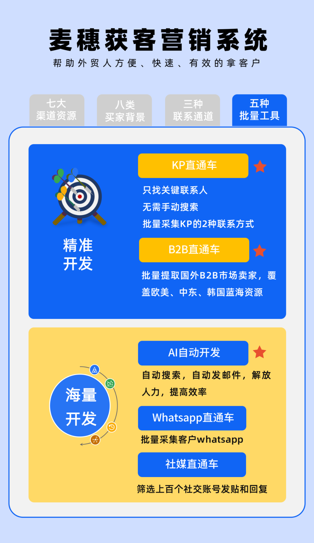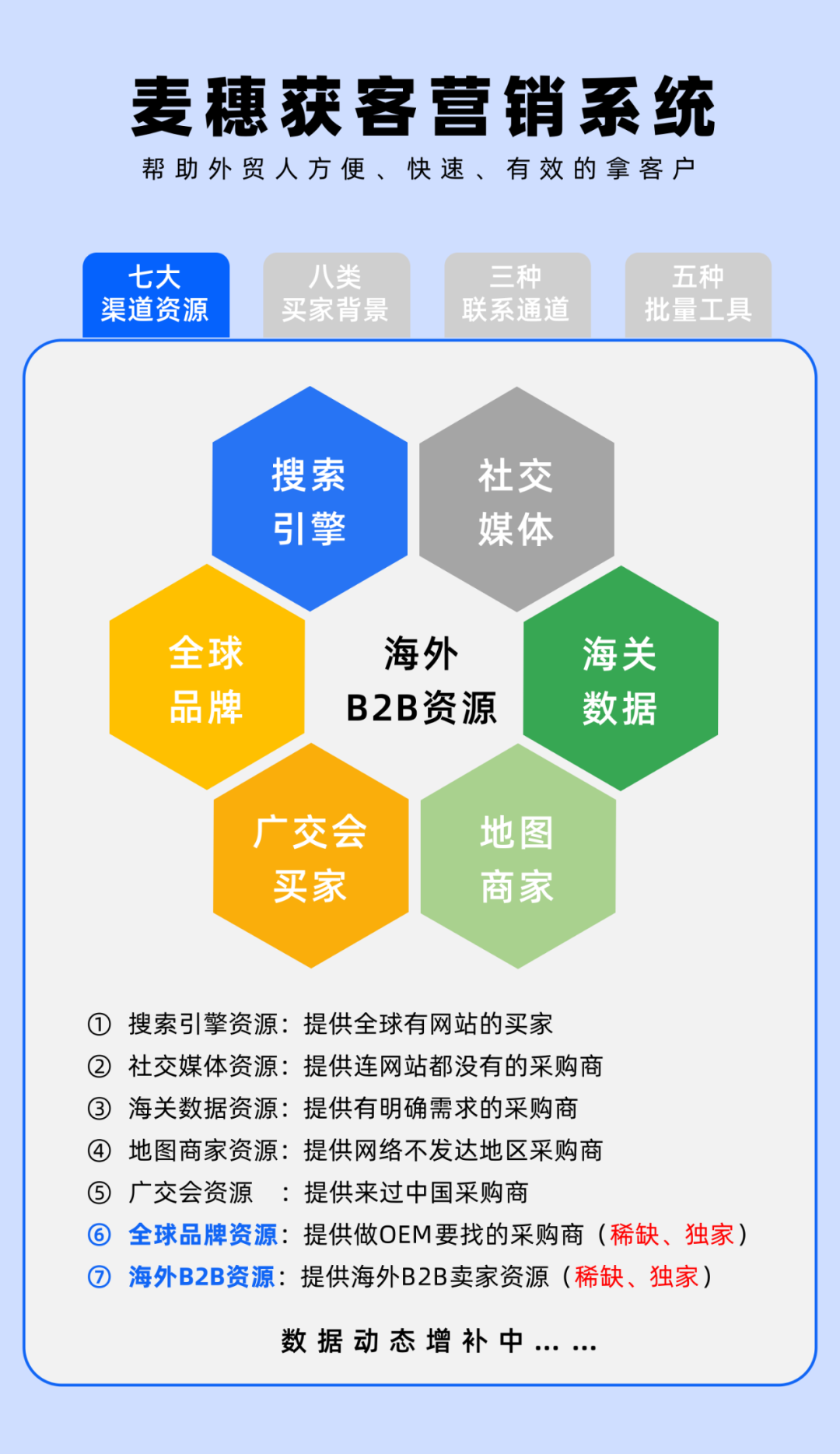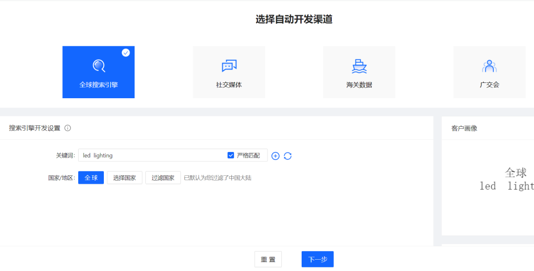 不同與以往的外貿開發(fā),需要業(yè)務員自己在不同的網站上,一個個輸入行業(yè)詞或者產品詞,去搜索客戶。在麥穗系統(tǒng)中,首先可以從【全球搜索引擎】、【社交媒體】、【貿易資源】、【廣交會】這些渠道中,獲得客戶源。