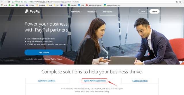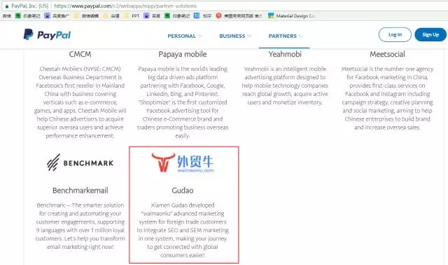 打開(kāi)PayPal英文版官網(wǎng),在“Digital Marketing Solutions(營(yíng)銷(xiāo)推廣)”中便可找到外貿(mào)牛的官網(wǎng)入口。未來(lái)雙方將在營(yíng)銷(xiāo)推廣、市場(chǎng)優(yōu)化、用戶(hù)服務(wù)等多方面展開(kāi)廣泛深入合作,為中國(guó)的廣大外貿(mào)企業(yè)構(gòu)建“出海”橋梁。