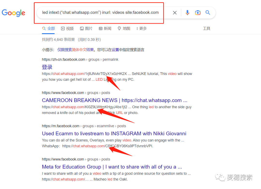 也可以從Facebook的視頻中搜索到WhatsApp群組,可以輸入下面這個語法:led intext:(“chat.whatapp.com”)inurl:videos site:facebook.com