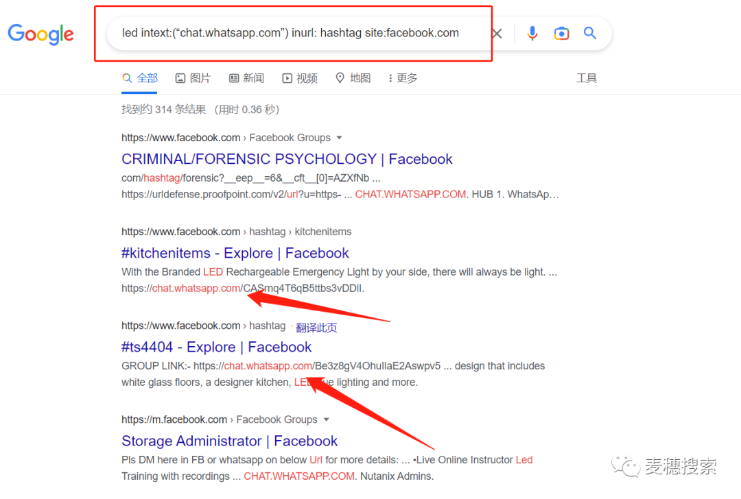 想要更細節(jié)的話,可以從Facebook的帖子中搜索,可以輸入:led intext:(“chat.whatsapp.com”)inurl:posts site:facebook.com