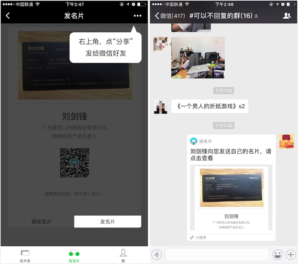 將自己的名片,通過微信分享給對(duì)方。在微信群中,一鍵收集所有人的名片,并向?qū)Ψ椒窒碜约旱拿?。與對(duì)方見面時(shí),互相掃描對(duì)方的名片二維碼。