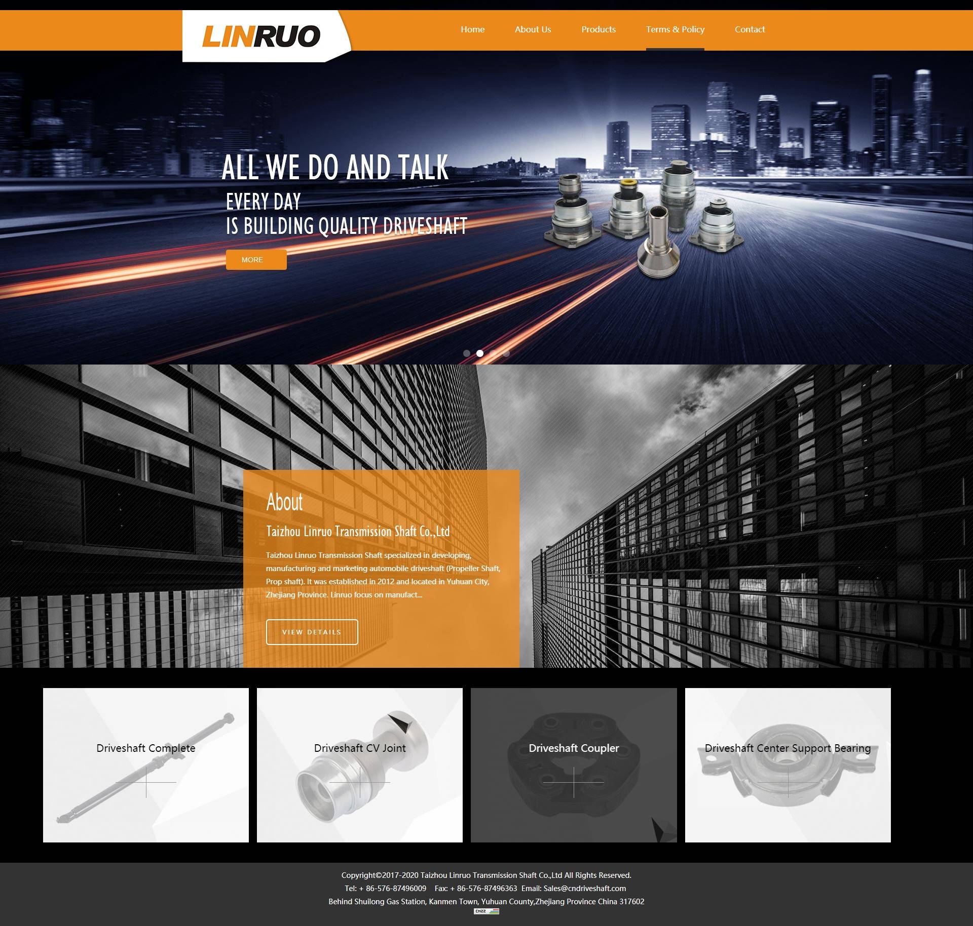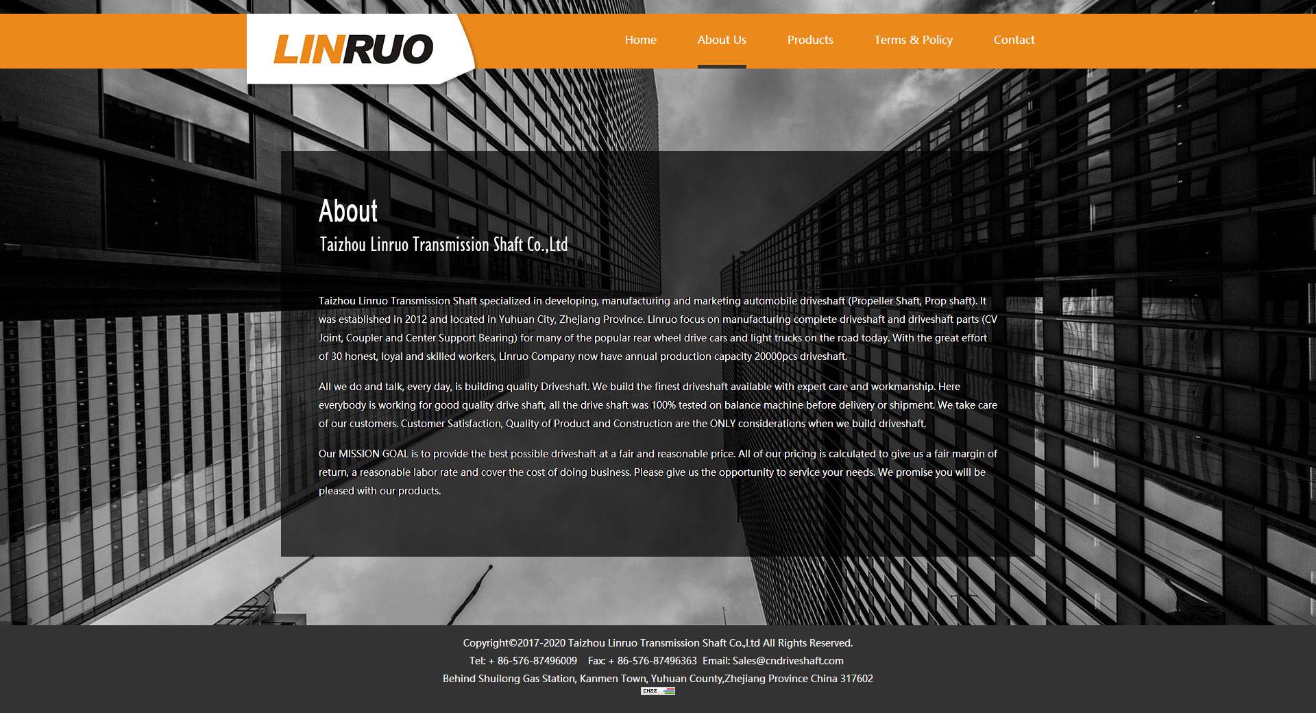 Taizhou Linruo Transmission Shaft specialized in developing, manufacturing and marketing automobile driveshaft (Propeller Shaft, Prop shaft). It was established in 2012 and located in Yuhuan City, Zhejiang Province. Linruo focus on manufacturing complete driveshaft and driveshaft parts (CV Joint, Coupler and Center Support Bearing) for many of the popular rear wheel drive cars and light trucks on the road today. With the great effort of 30 honest, loyal and skilled workers, Linruo Company now have annual production capacity 20000pcs driveshaft.